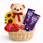 A charming gift basket featuring a soft teddy bear paired with a selection of premium chocolates. Perfect for birthdays, romantic surprises, anniversaries, or sweet gestures that bring a smile instantly. Beautifully arranged and ready to gift.