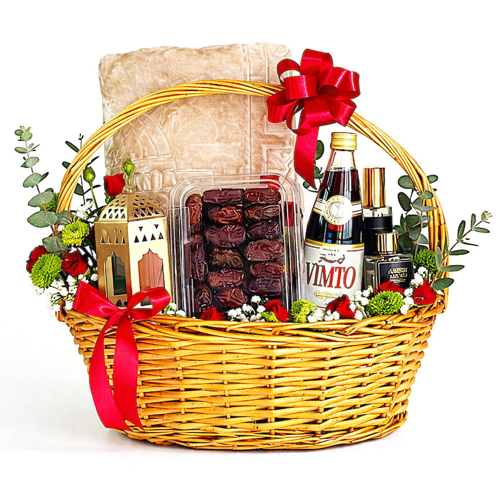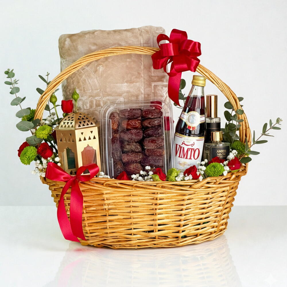 Celebrate the spirit of Ramadan and Iftar traditions with this thoughtfully curated gift hamper, beautifully arranged in a premium woven basket. This hamper includes premium dates, fresh floral accents, a soothing scented candle, a decorative Ramadan lantern, aromatic musk room fragrance, a soft prayer mat, and the classic Vimto refreshment drink perfect for breaking fast with family and loved ones. An ideal choice for Ramadan gifting home celebrations or thoughtful corporate presents.