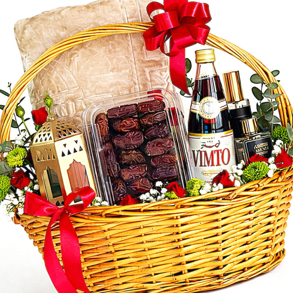 Eucalyptus - 3 pcs Spray rose - 1 pcs Basket - 1 pcs dates - 1 pcs scented candle - 1 pcs ramadan lantern - 1 pcs prayer mat - 1 pcs aromatic musk room fragrance - 1 pcs classic vimto refreshment drink - 1 pcs