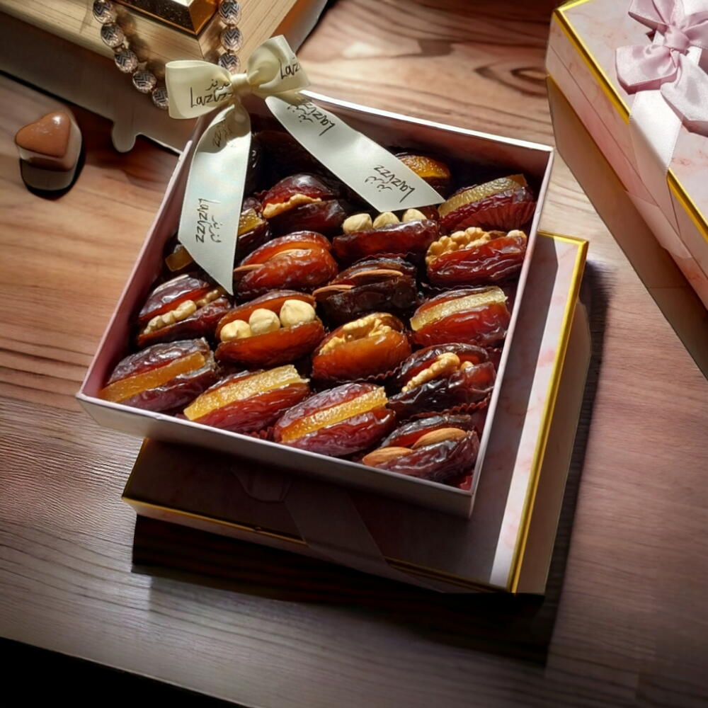 Jordan mejdool dates stuffed with hazelnuts, almonds, walnut and orange peel.