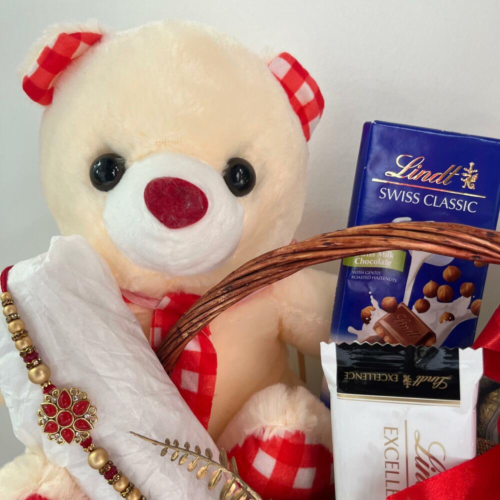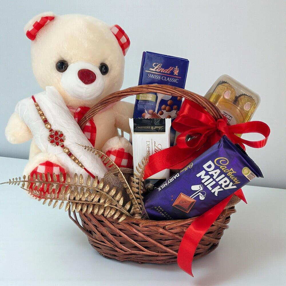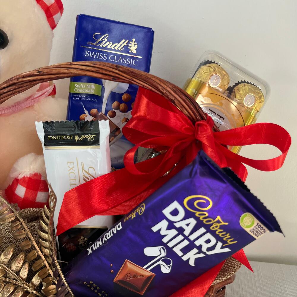 Basket - 1 pcs teddy - 1 pcs fillers - 1 pcs lindt swiss classic milk chocolate bar (100g) - 1 pcs 16 piece ferrero rocher box - 1 pcs dairy milk cadbury bar - 1 pcs lindt swiss classic chocolate bar (70g) - 1 pcs