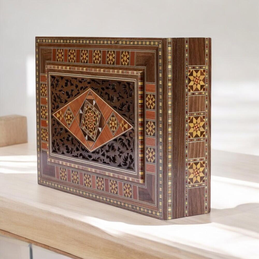 This handmade wooden gift box is filled with premium quality mejdool dates stuffed with orange peel, almond, walnut This luxurious wooden box is filled with an exquisite assortment of premium dates, each carefully stuffed with a selection of the finest nuts like walnuts, hazelnuts, and almonds. The dates are perfectly arranged inside the plush red velvet interior, providing an indulgent visual treat. Whether enjoyed as a snack or shared with loved ones, this gift box offers a delightful mix of sweetness and crunch in every bite. The elegant design of the box makes it the perfect gift for any occasion, adding a touch of luxury and sophistication. Perfect for celebrating special moments, this treat will captivate both the eyes and the taste buds. Give the gift of luxury with this elegantly presented date box – a true symbol of indulgence.
